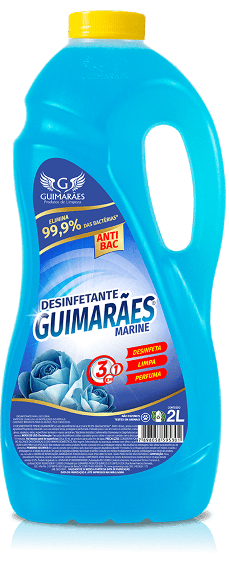 O DESINFETANTE MARINE GUIMARÃES é um desinfetante que mata 99,9% das bactérias*. Além disso, possui uma agradável fragrância, deixando sua casa sempre limpa, protegida e perfumada. Indicado para o uso em todos os ambientes, como: pisos, azulejos, ralos, superfícies laváveis e vasos sanitários. *Bactérias testadas: Salmonella choleraesuis e Staphylococcus aureus.