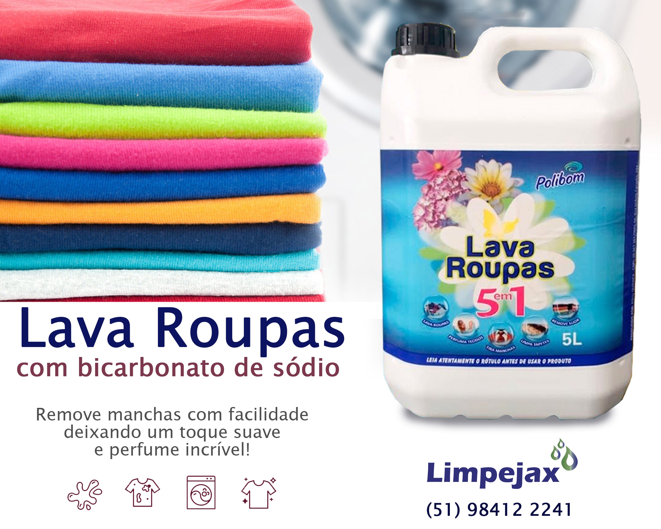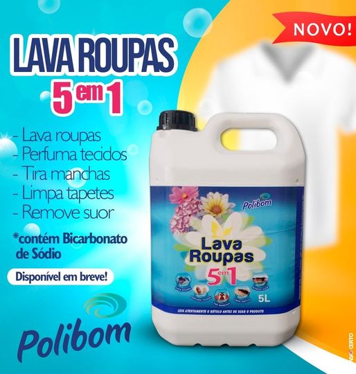 Lava Roupas 5 em 1 Polibom 5L possui na sua formula um agente poderoso na remoção de manchas, bicarbonato de sódio. Além deste agente poderoso, possui concentração de perfume e é indicado para todos os tipos de tecido, incluindo os mais pesados como: Tapetes, Cobertores, Toalhas etc.